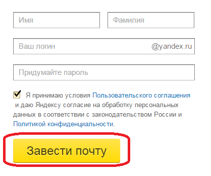 Введите свои данные, придумайте логин и пароль, согласитесь с условиями Пользовательского соглашения и нажмите Завести почту: