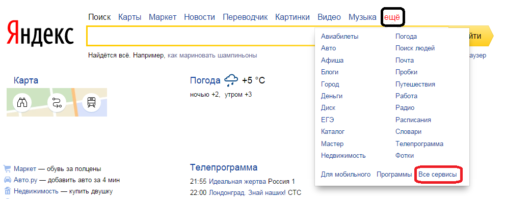 После создания почты и авторизации в системе, перейдите к списку всех сервисов Яндекса. Для этого на главной странице сервиса нажмите Еще, затем в открывшемся окне Все сервисы: