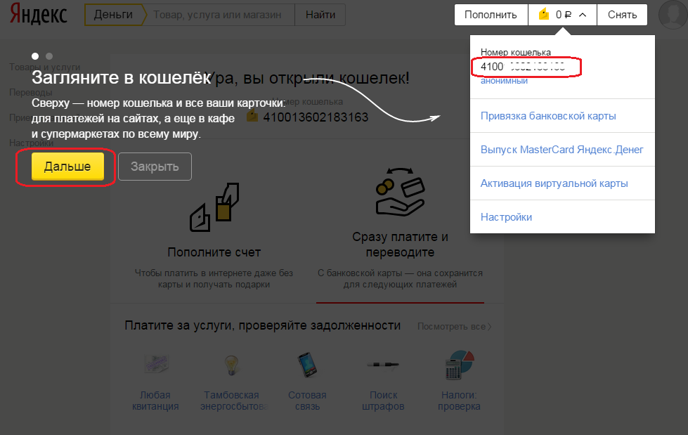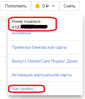 В верхнем правом углу Вашего личного кабинета существует меню из трех кнопок: Пополнить, 0 руб. и Снять. ? Цифра 0 это и есть баланс Вашего кошелька. Нажмите на цифру О (Ваш баланс) и увидите номер Вашего кошелька. Нажимаем Настройки: