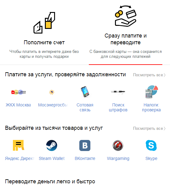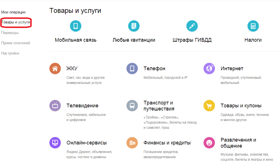 Товары и услуги. Здесь представлены все возможные товары и услуги за которые существует возможность рассчитаться электронными деньгами на сервисе (гасить кредиты, оплачивать услуги ЖКХ, оплачивать интернет, мобильную связь, телевидение, штрафы и т.п.).