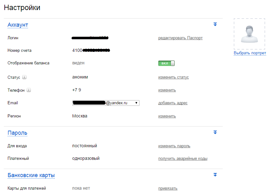 Аккаунт. Эта вкладка хранит в себе личные данные пользователя. Если со временем у Вас возникнет необходимость изменить Ваши персональные данные, то в разделе Аккаунт нажмите редактировать Паспорт и произведите необходимые изменения. Чтобы на всех страницах различных сервисов Яндекса не был виден баланс Вашего счета в системе, сдвиньте переключатель Отображение баланса в положение «выкл».