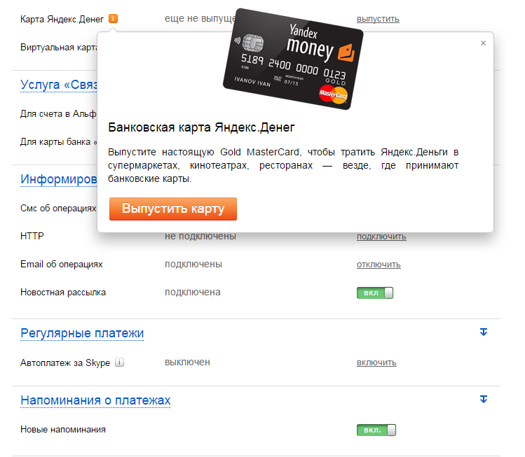 Банковские карты. Этот раздел меню Настройки позволяет привязать Вашу банковскую карту к Вашему кошельку в системе и заказать пластиковую карту платежной системы Яндекс.Деньги (при необходимости).