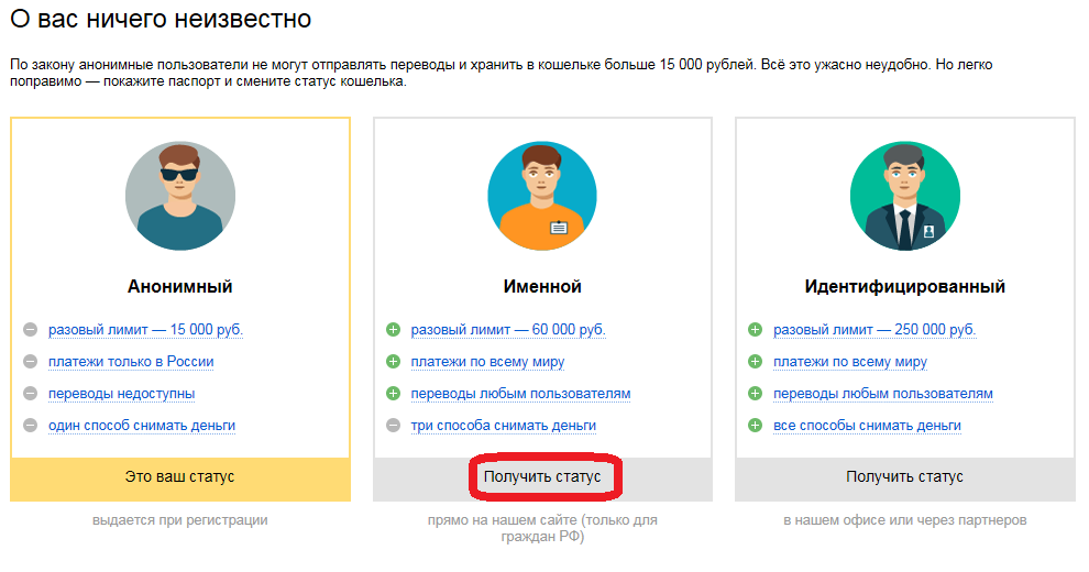 Сразу после регистрации все пользователи электронных кошельков приобретают статус «Анонимный», потому что никаких данных о себе кроме номера Вашего телефона Вы пока не оставили. У данного статуса имеется ряд существенных ограничений: отсутствует возможность делать денежные переводы, размер Вашего баланса ограничен 15 тысячами рублей и снять деньги возможно только одним способом. Чтобы посмотреть Ваш текущий статус или изменить его, нажмите на него под номером счета в личном кабинете: