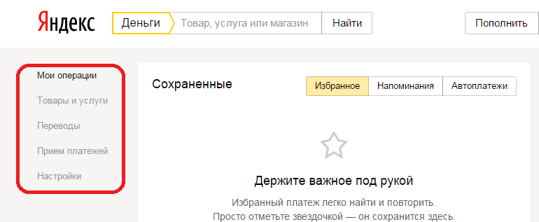 Теперь давайте научимся пользоваться кошельком Яндекс.Деньги. Все функциональные разделы Вашего Яндекс.Деньги кошелька находятся в левом вертикальном меню. Вот они: