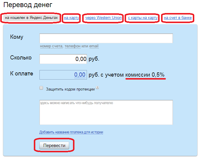 Переводы. Самый необходимой раздел сервиса, из-за которого, наверное мы и создаем Ваш кошелек. Очень часто, оплачивая какую-нибудь покупку в интернете, Вам будет нужно сделать перевод на электронный кошелек Яндекс.Деньги. Сделать это очень просто. Заходим в данный раздел. Выбираем куда Вы хотите сделать перевод (в 90% случаев это кошелек Яндекс.Деньги), набиваете Кому (указываете номер счета получателя) и вбиваете сумму перевода (обратите внимание на комиссию), нажмите Перевести. Если Вы переводите значительную сумму неизвестному адресату, то Вы можете включить опцию Защитить кодом протекции, тогда указанный адресат сможет получить Ваши средства только после получения от Вас этого специального кода.