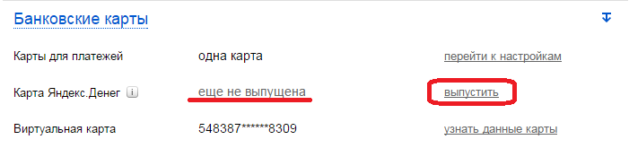 Большинство солидных и популярных платежных систем в настоящее время выпускают для своих пользователей пластиковые банковские карты, исключением тут не стала и платежная система Yandex Money, которая тоже предлагает своим пользователям получить полноценную банковскую карту Яндекс.Деньги. Ее баланс будет равен Вашему счету в системе Яндекс.Деньги. Срок ее действия - 3 года, обслуживание - 249 руб. за 3 года (разово в момент приобретения), комиссия при оплате товаров - 0%, снятие наличных в банкомате - 3% комиссия + 15 руб. Если Вам нужна такая карта, тогда зайдите в раздел Настройки и найдите банковские карты. Вы видите, что Ваша карта еще не выпускалась, тогда нажимайте выпустить: