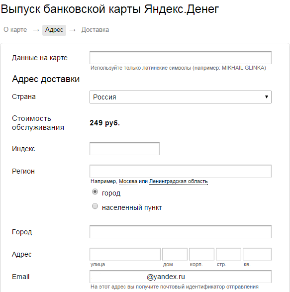Теперь заполните все данные анкеты и укажите адрес, куда следует прислать пластиковую карточку. После заполнения нажмите Выпустить карту: