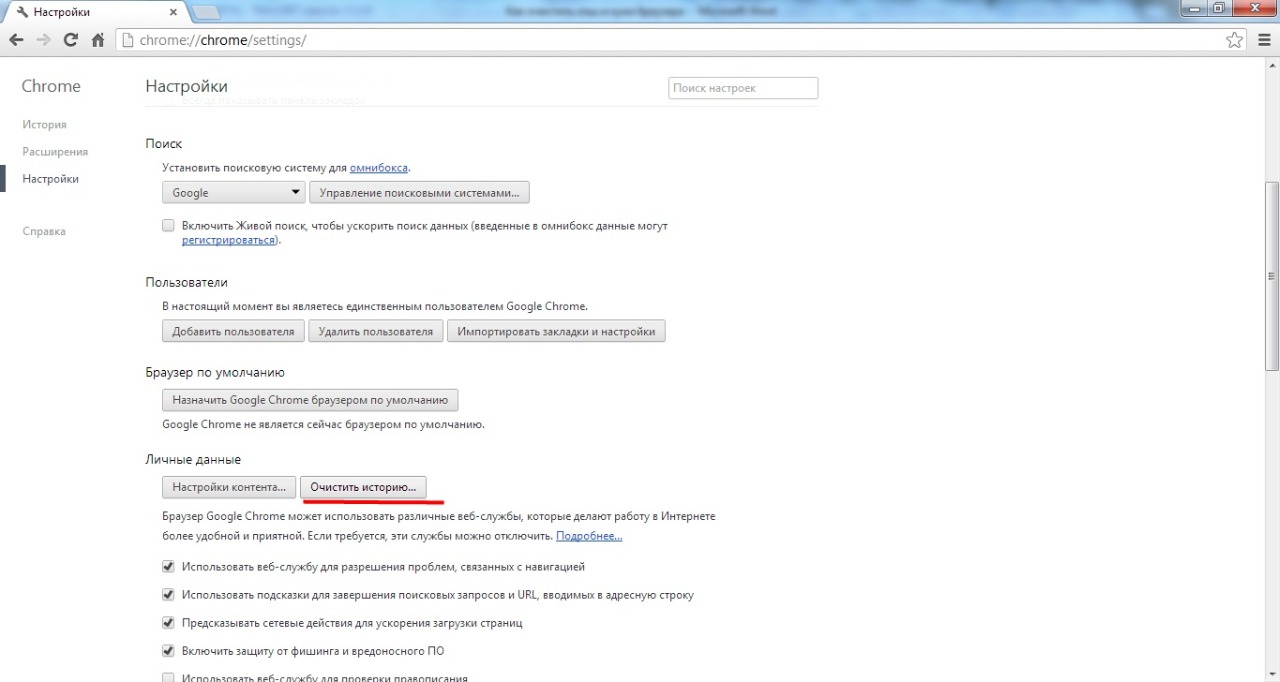 В графе «Личные данные» нажимаем кнопку «Очистить историю…».