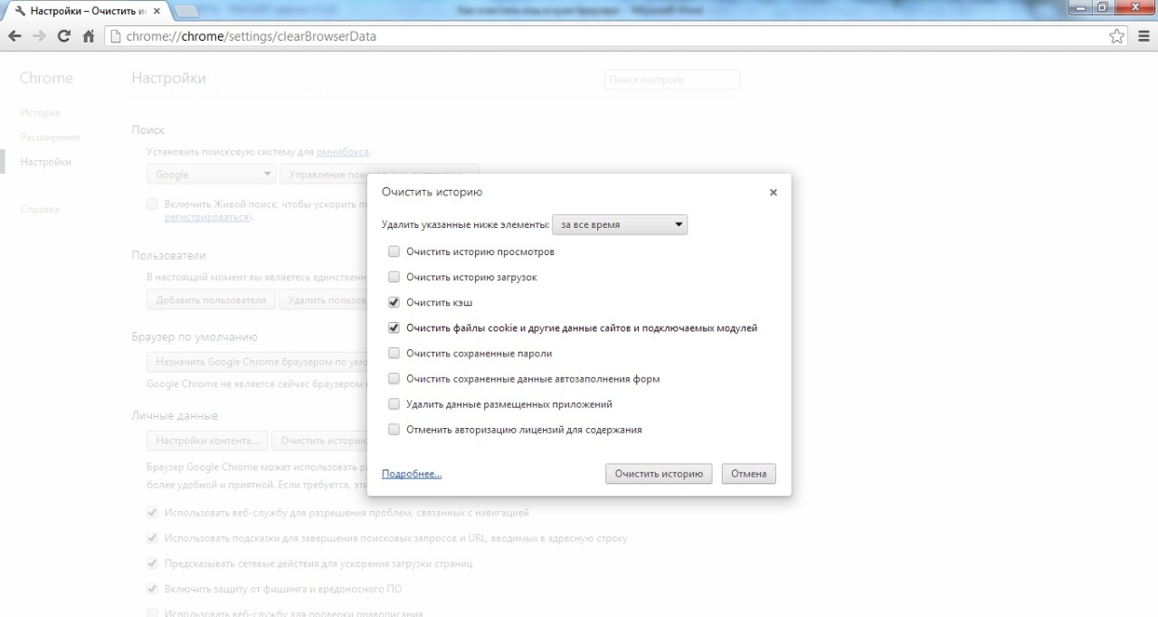Теперь куки и кэш в хроме очищены. Можно также нажать комбинацию клавиш: CTRL+SHIFT+DEL и Вы сразу попадете в меню Очистить историю. Для индивидуального удаления куков только для определенных сайтов, необходимо в графе «Личные данные» нажать «Настройки контента…» и в появившемся окошке выбрать «Все файлы cookie и данные сайтов…».