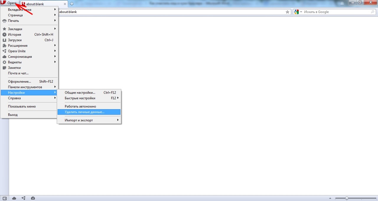 В опере очитка кэша и куков также не займет много времени. Заходим в «Меню / Настройки / Удалить личные данные».