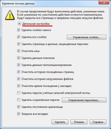 В появившемся окошке нажимаем «Детальная настройка» и устанавливаем галочки напротив необходимых пунктов, затем нажимаем «Удалить».