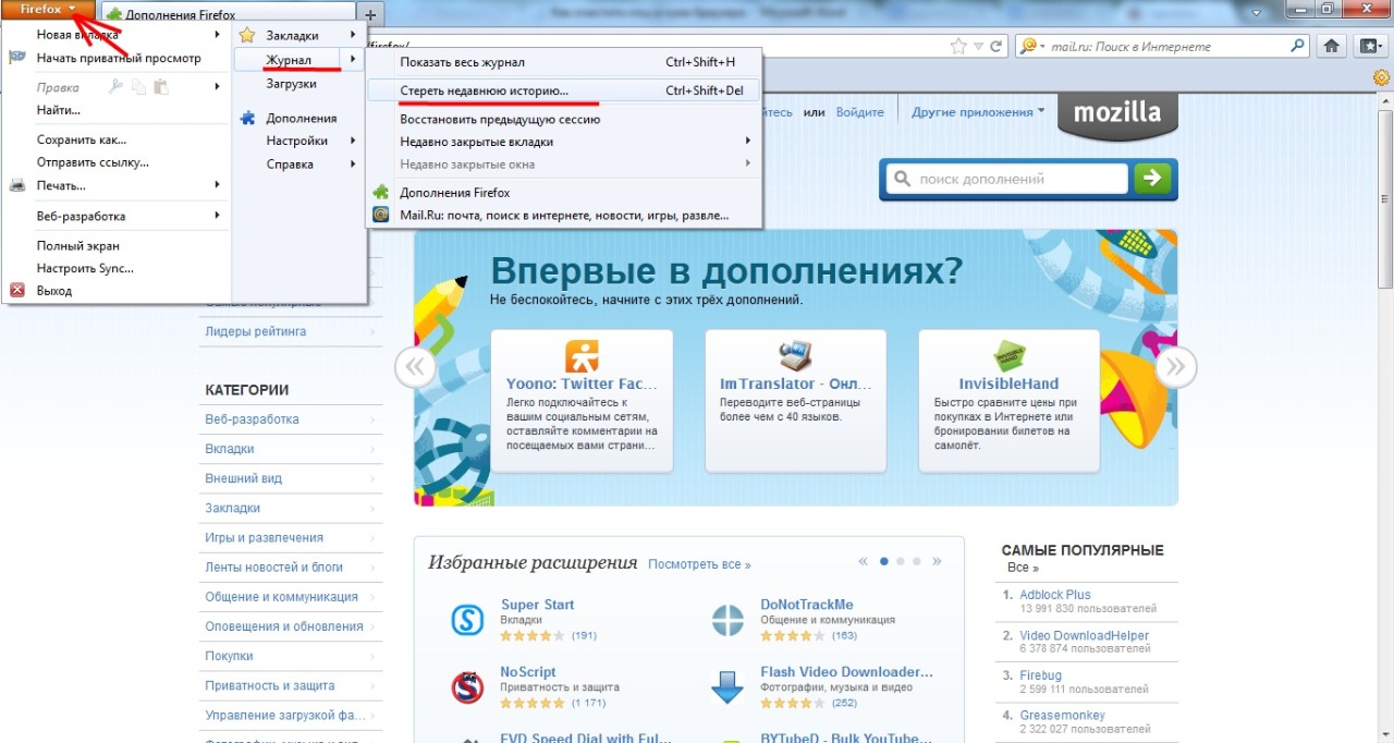 В мозиле также есть несколько способов удалить куки и кэш. Сначала рассмотрим, как удалить все куки и очистить сразу кэш. Заходим в меню «Журнал / Стереть недавнюю историю…».