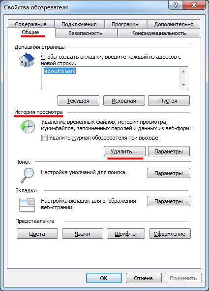 Насколько бы загадочен не был Internet Explorer, в нем действия по удалению куков и очистке кэша производятся также просто. Заходим в «Свойства обозревателя» и на вкладке «Общие» находим графу «История просмотра», где нажимаем кнопку «Удалить…».