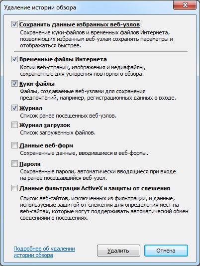 В появившемся окошке отмечаем необходимые пункты и нажимаем «Удалить».